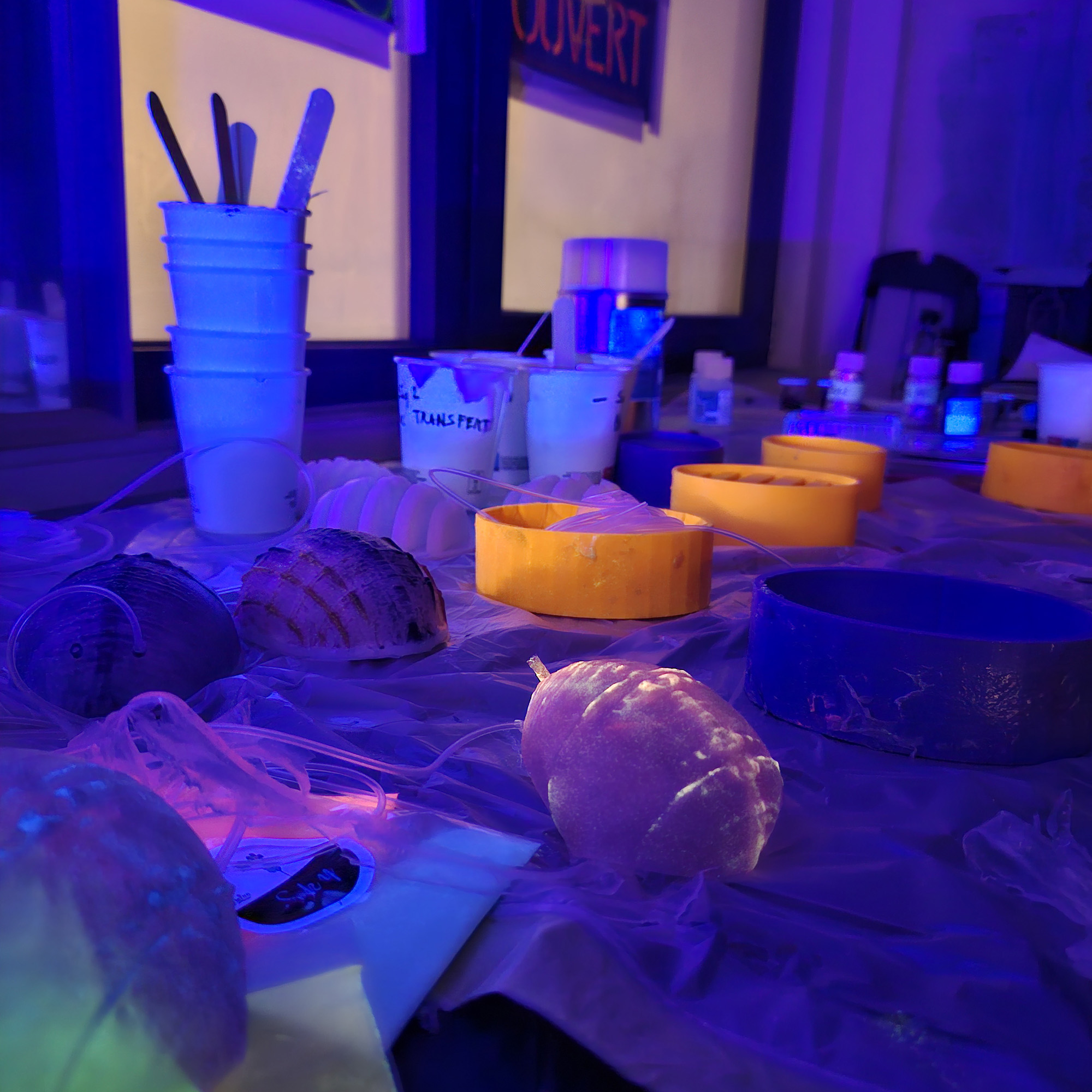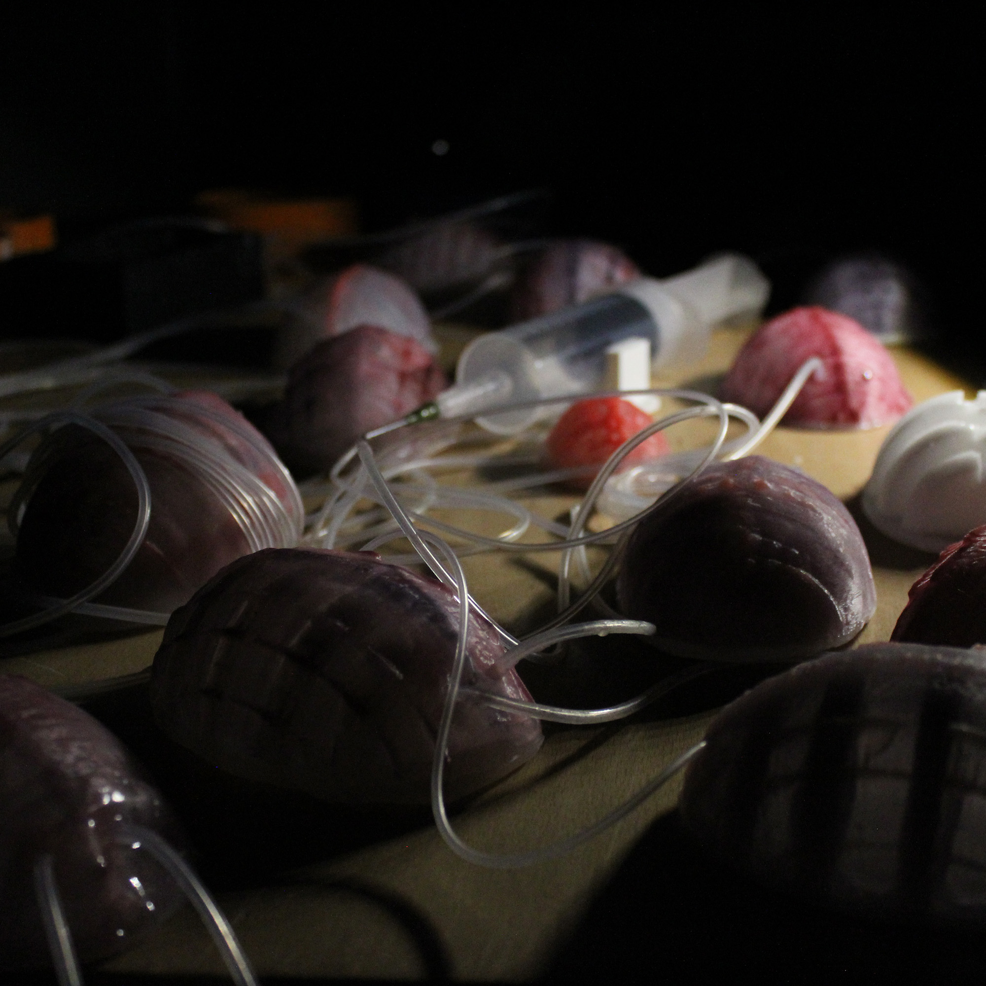 Dans la lignée des nombreuses œuvres de fiction utilisant le parallèle vivant / numérique, l’installation Parasites cherche à matérialiser ces sons sous forme de créatures que l’on croirait vivantes, qui inspirent le dégoût, créent le malaise. Des créatures organiques qui respirent, se gonflent et se nourrissent des bruits de l’ère numérique. Ces créatures sont générées à partir d’enregistrements sonores de notre quotidien, puis mises en scène et activées grâce à des pompes, parasitant des appareils abandonnés.